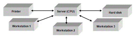Consider a small network with some workstations and some resources. The network has a server. The server has a CPU. This has to service a number of workstations as well as all of the peripherals. We can represent this with the following diagram.